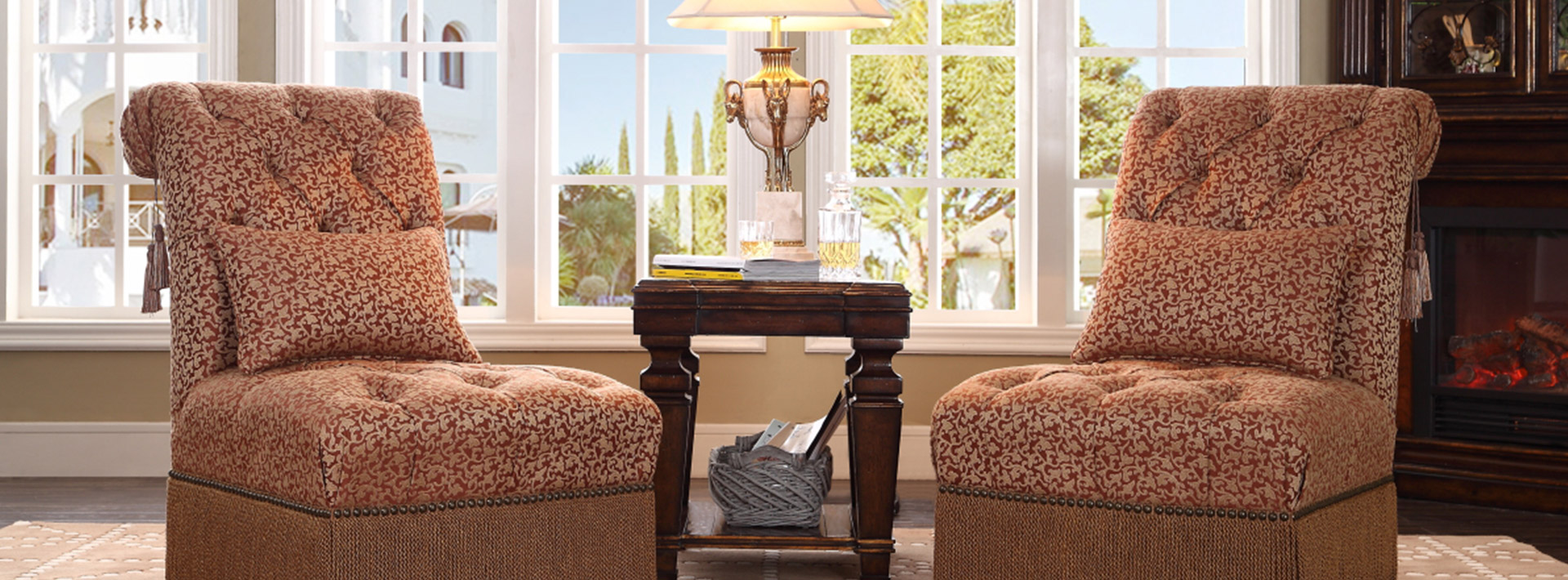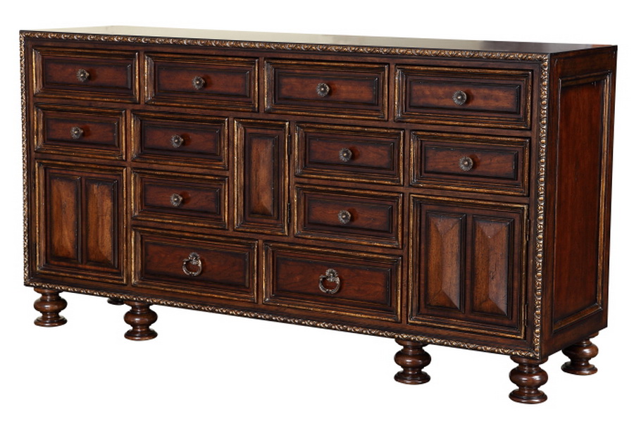 維拉莊園這一套系融合了各個時期的經(jīng)典設(shè)計,既有英國攝政時期的莊嚴(yán)舒適,也有法國路易·菲利浦時期的古典雅致,富有感染力的溫暖涂裝,精巧的木皮工藝,精美鐵藝線條等完美配合,散發(fā)著舊時光的魅力,同時也為“奢華”設(shè)立了新標(biāo)準(zhǔn),讓任何一個鄉(xiāng)村或者城市的家再現(xiàn)高雅。櫻桃木與黃花樟樹瘤拼花飾面,配以V型鏤槽和凹凸不平面板效果,使家具更顯大氣,精致的手工雕刻,莊重典雅,配以大理石,皮革帶來不同的家居感受,少量的破壞處理巧妙的增添了歲月的痕跡,彰顯了莊園氣勢。